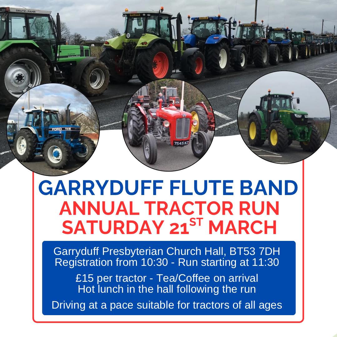 Notes: Meeting at Garryduff Presbyterian Church Hall, Ballymoney, BT53 7DH from 10.30. Run starts at 11.30 £15 including lunch. Vintage, Classic and modern tractors welcome. Vintage Tractors will set the pace.